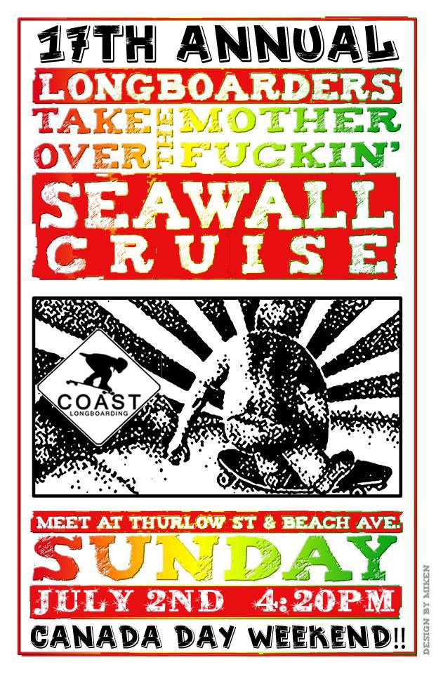 The 17th Annual Coast Longboarding Seawall Cruise is coming up Canada Day weekend, July 2nd, 4:20 Pm under the Big Tree by the Vancouver Aquatics Centre. You’ll see all the skaters, don’t worry. Or contact the event page.