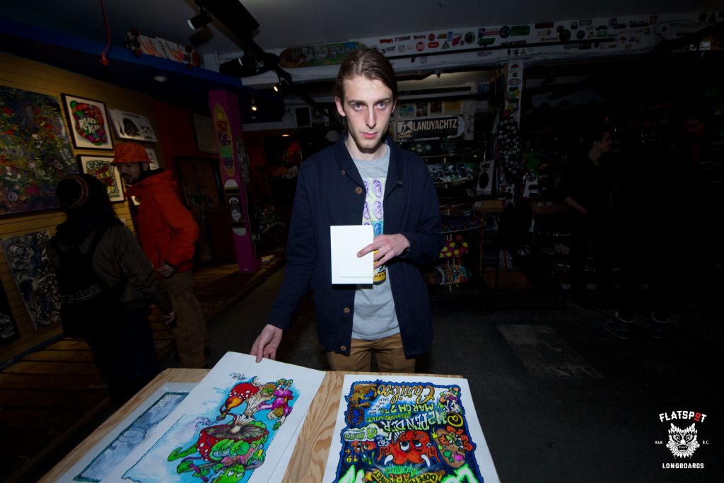 The Low Brow Art Auction had an epic vibe. That might sound all hippy-dippy, but its true, the energy was spot on, and skaters and artists alike were inspired. Stressed & Depressed Dispensary brought out an incredible selection of art. Bob High explained the art theory and stylistic approach to the art on display (art history degree, go figure). Alain Sayers was AMPED on everything, and was contagiously stoked, we even still have some of his prints for sale in the store. Plus Ken Foster SHOWED UP! Might have been last minute, but that talented man managed to sell 100% of what he brought, despite the fact it was the last few minutes of the show. Big ups to Les Robertson for taking photos of the event!