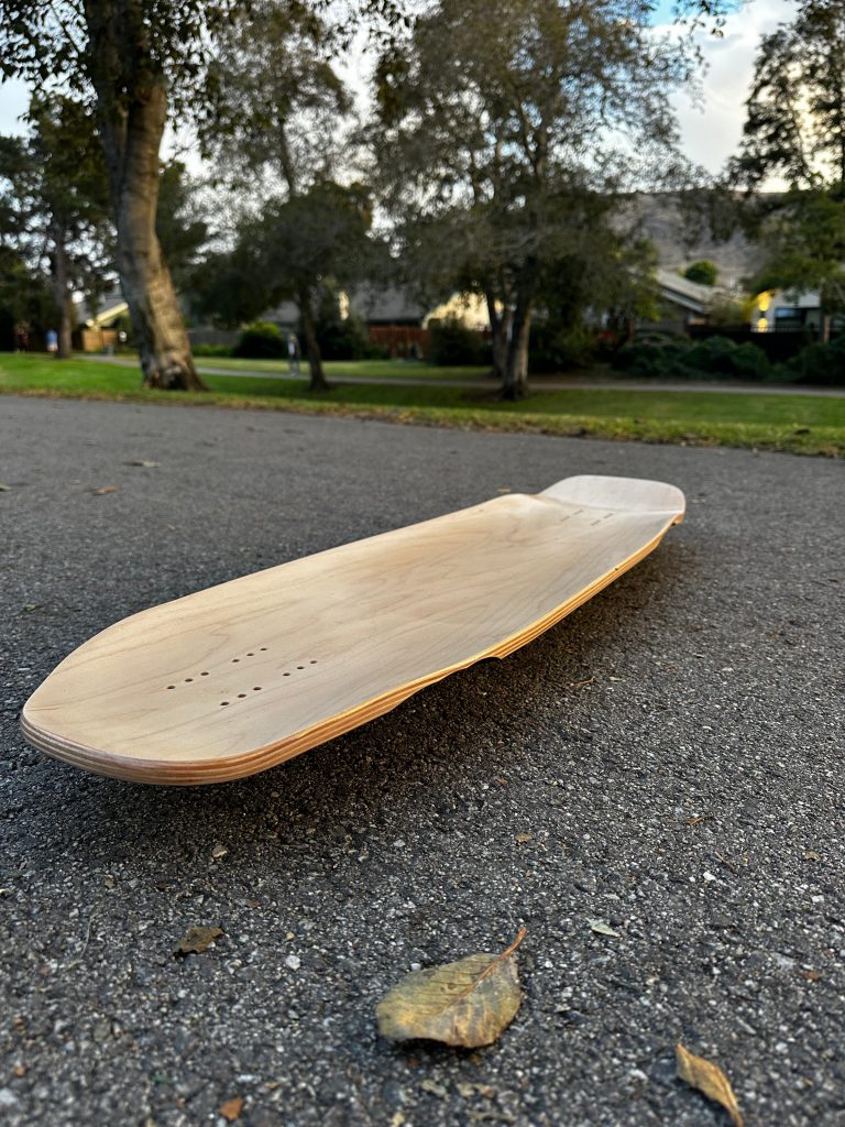The Earthwing Earthwang 38.5 is a freeride oriented single kick with wheelbase options from 23 inches to 25 inches spaced out in half inch in increments. It is made from 8 plies of maple and one composite layer making it a total of nine plies thick. The stance within the truck mounts is symmetrical and the flare placement relative to the mounting is also symmetrical. The shape is slightly tapered and the concave between the mounting is symmetrical making it ideal for straight road free ride, and more boat-y open road skating. It still features a healthy kick tail to make pop tricks possible on all three wheelbase options in the rear. This deck makes for an ideal quiver Killer and is our take on the single kick meta. If you want the most downhill variety in a sturdy single deck, then this will be the way to go if you’re looking at advanced free ride and higher speeds.