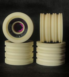 OJ’s 95a high performance urethane offers a more forgiving durometer for rough terrain with easy, consistent power slides and bark you normally get with a harder urethane.
