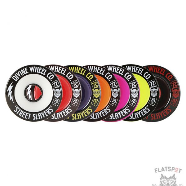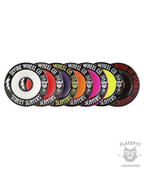 The “Street Slayers” design is best for getting slideways through mountain corners! It’s designed for consistency from start to finish. The slightly offset core and shape ensures that as it wears down the lips stay nice and round, ensuring a perfect slide. Slayers are poured in our exclusive long lasting freeride/slide formula into our proprietary Street Slayer mold.The Divine team spent over a year developing the shape and urethane formula, so you can bet it’s spot on.Stone ground and ready to shred, they come in both 78a and 82a hardnesses.