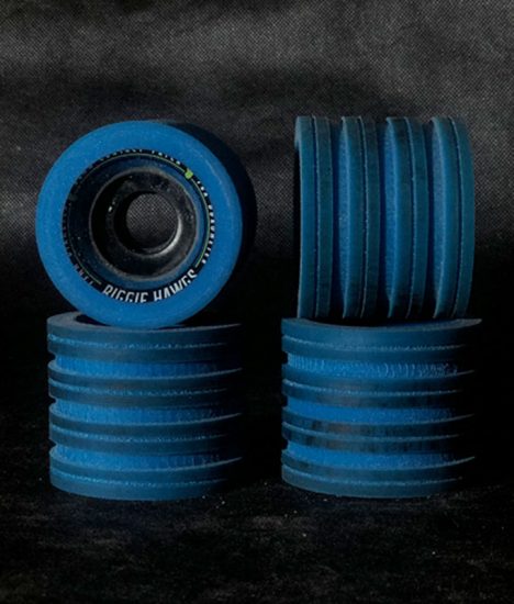 Each set of Flatspot Upcycled Rain Grooved Wheels are unique and custom made, by hand, by a skateboarder with over a decade of wheel machining experience. Flatspot uses a now, mostly standard, groove pattern and edge trim that has been tested by our experienced team of pro and am riders across the globe, in countless riding environments and road surfaces from casual cruising to World Cup Downhill races. If you would like a custom set of wheels either with a specific brand of wheel or style of groove pattern, we can make individual sets on demand, on request.