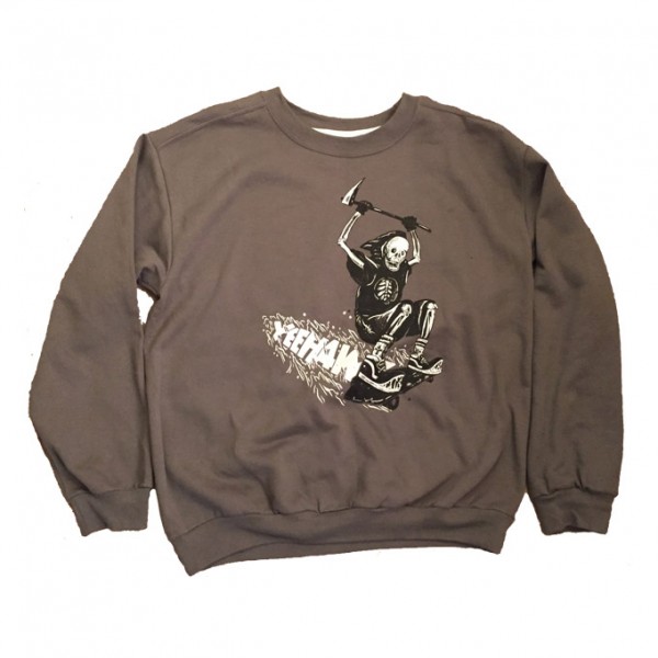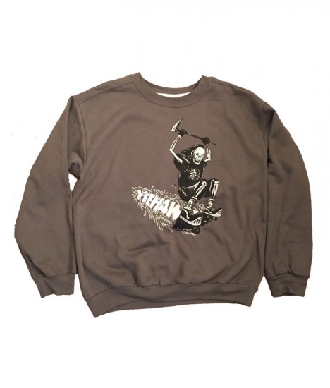 The Grim Reaper tears up the road in search of your lost soul. Find it now in this, soft as unicorns fur, crewneck sweater. Charcoal grey sweater with a white and black print on the front.