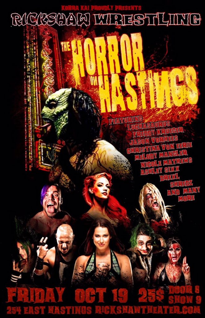 Welcome to Rickshaw Wrestling, the Horror on Hastings! Prepare yourself for this Friday, October 19th at the historic Rickshaw Theatre, an evening of Punches and Kicks, Treats and Tricks. Watch as your favorite Horror villains come to life inside of the wrestling ring at this one of a kind, once in a lifetime experience that is sure to make you laugh and cry, shriek and scream all night long.